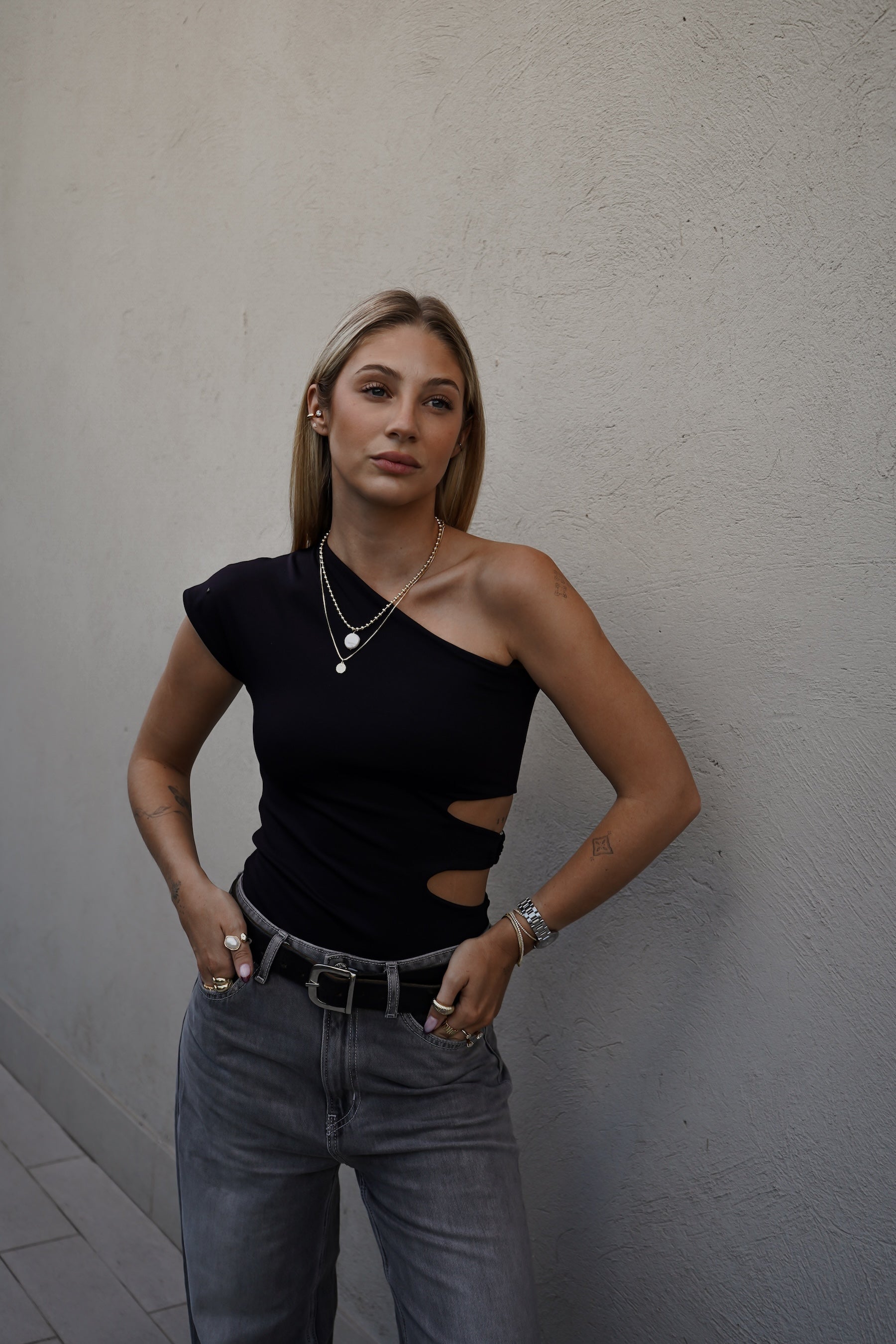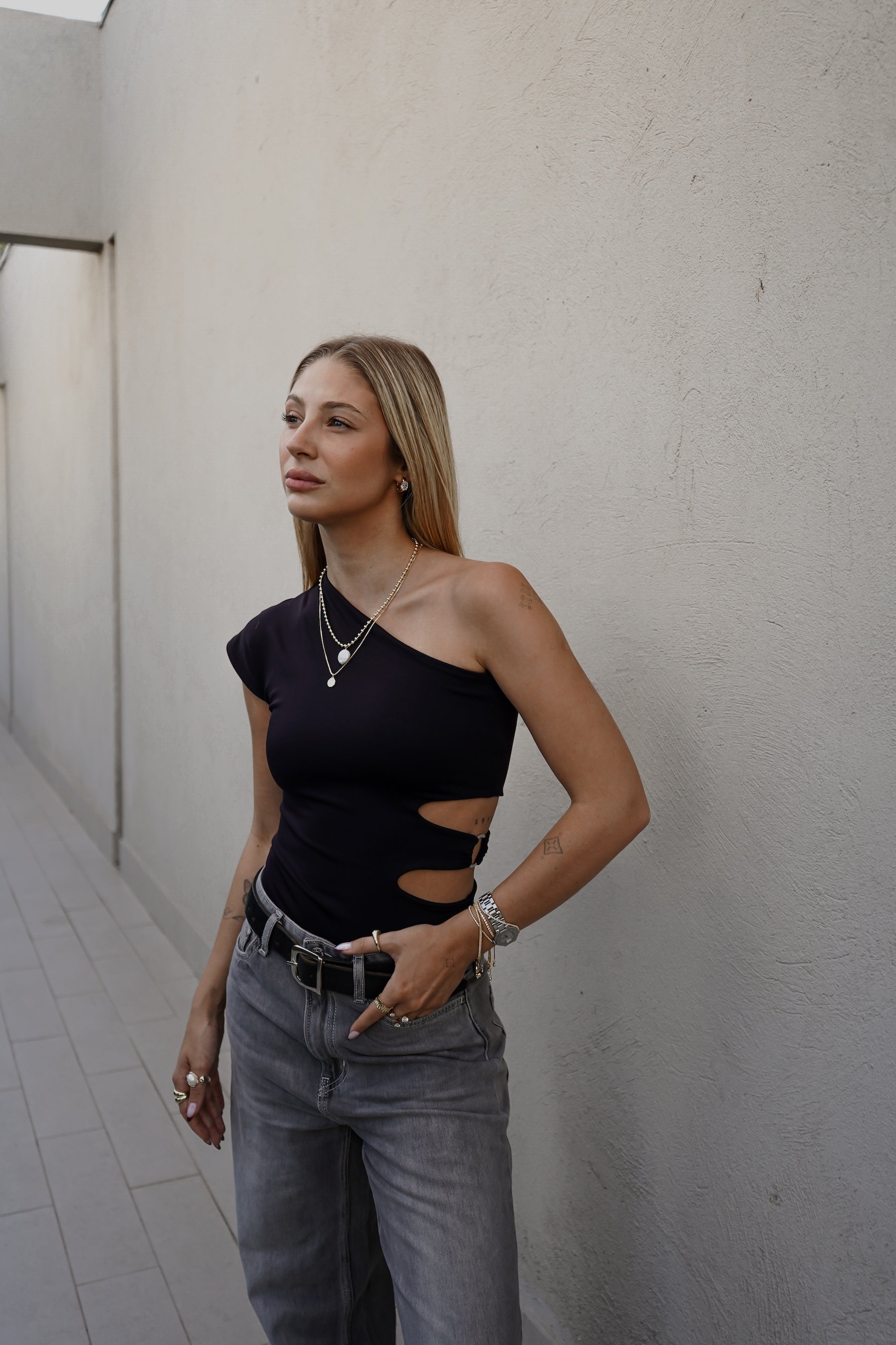Body con corte asimétrico, doble tela en cuerpo y espalda.