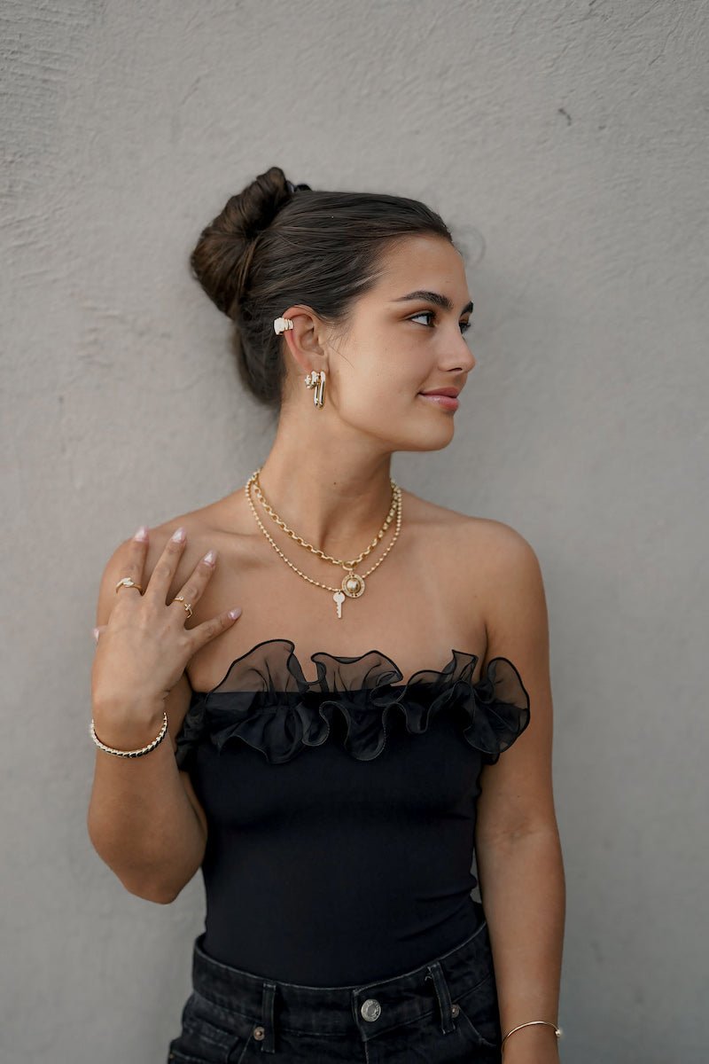 Body strapless con broches a presión antioxidables, Doble tela sin costuras y vuelos de gasa. De Tela elasticada adaptable con elástico interior en corte recto para más firmeza.
