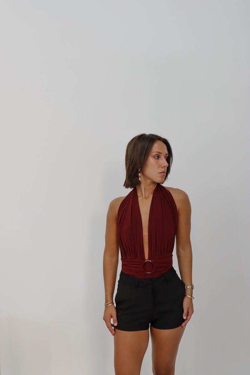 Body escotado con argolla de resina, doble tela en todo el cuerpo. Incluye broches a presión en entre piernas.